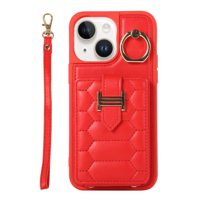 For iPhone 13 Vertical Card Bag Ring Holder Phone Case with Dual Lanyard(Red)