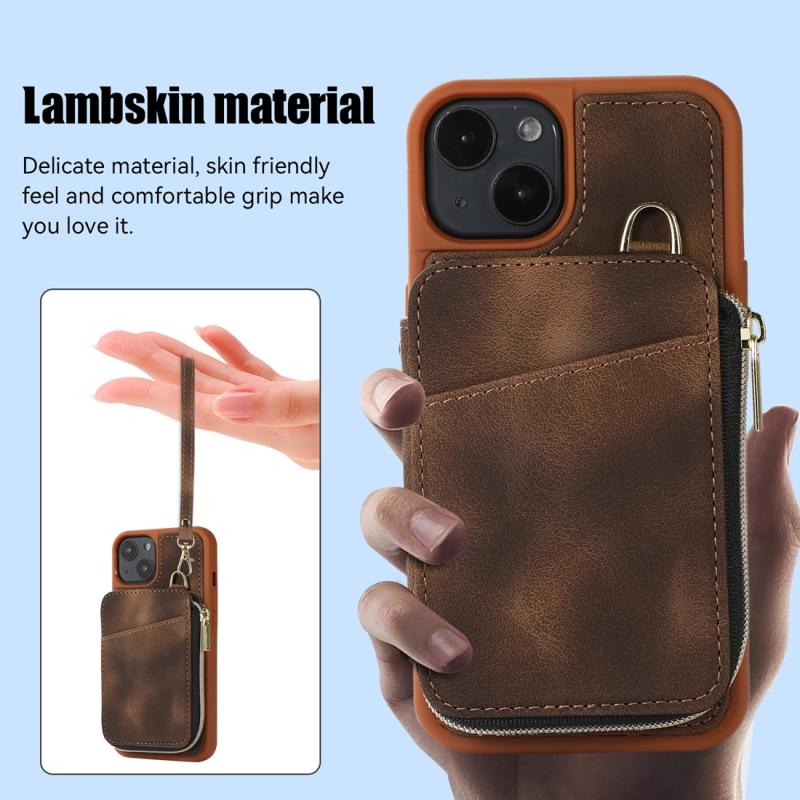 For iPhone 13 Zipper Card Bag Back Cover Phone Case(Brown)