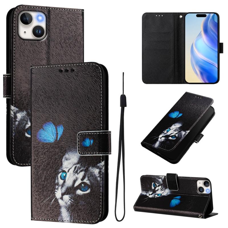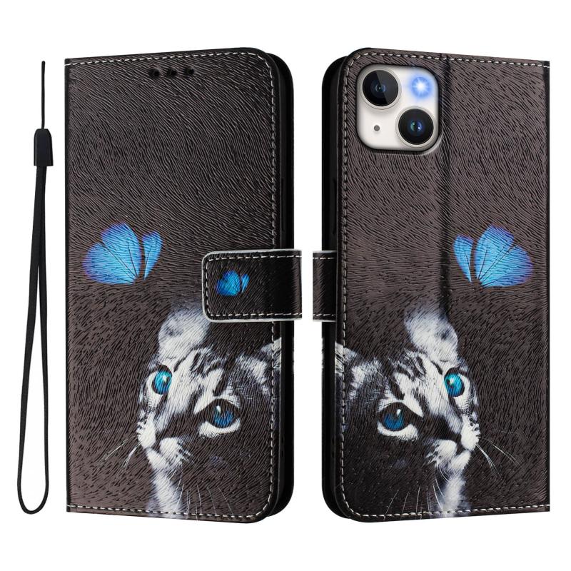 For iPhone 14 / 13 Art Colored Drawing Pattern Leather Phone Case(Butterfly cat)