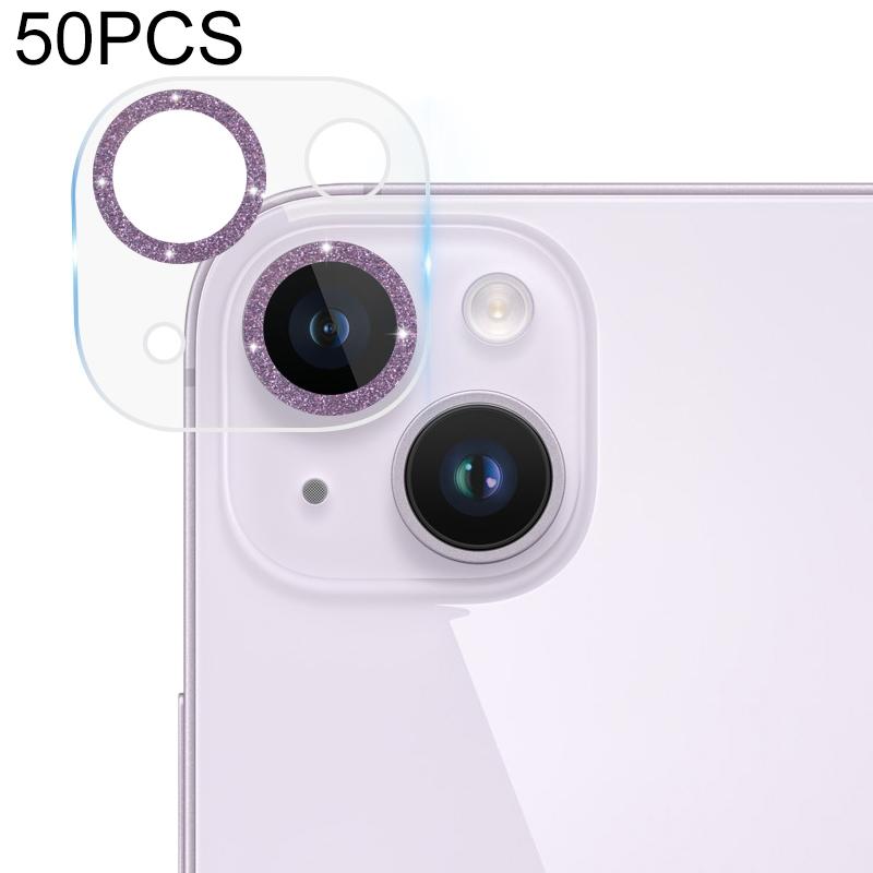 For iPhone 14 / 14 Plus 50pcs Tempered Glass Glitter CD Texture Back Camera Film(Purple)