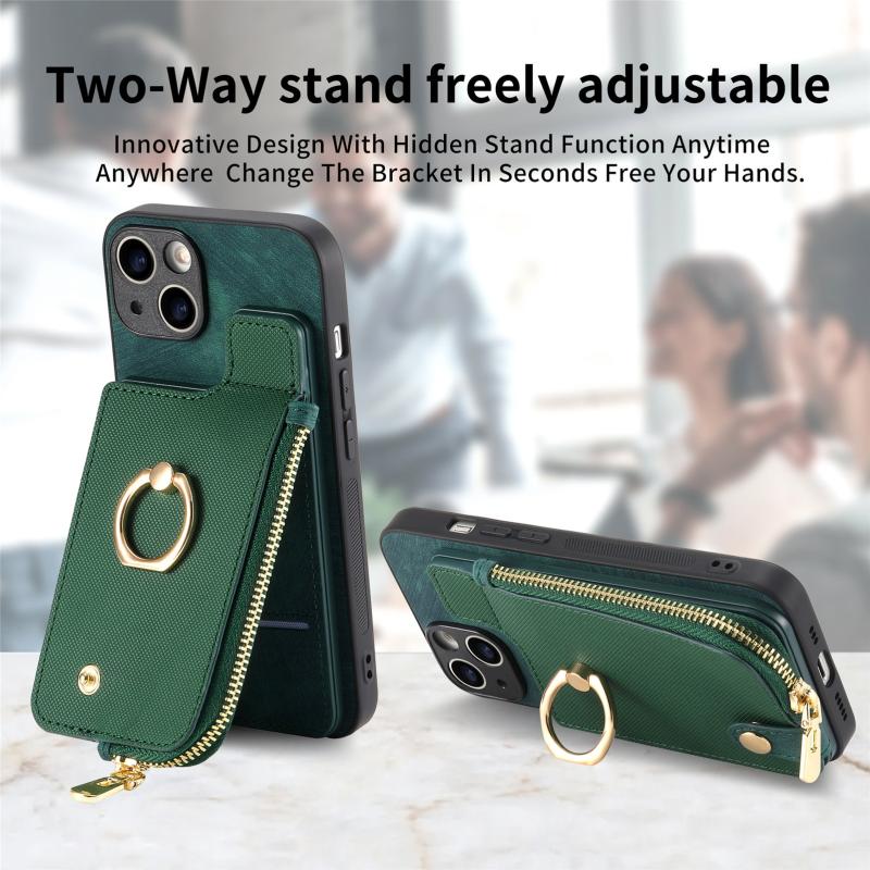 For iPhone 14 Cross Leather Ring Vertical Zipper Wallet Back Phone Case(Green)