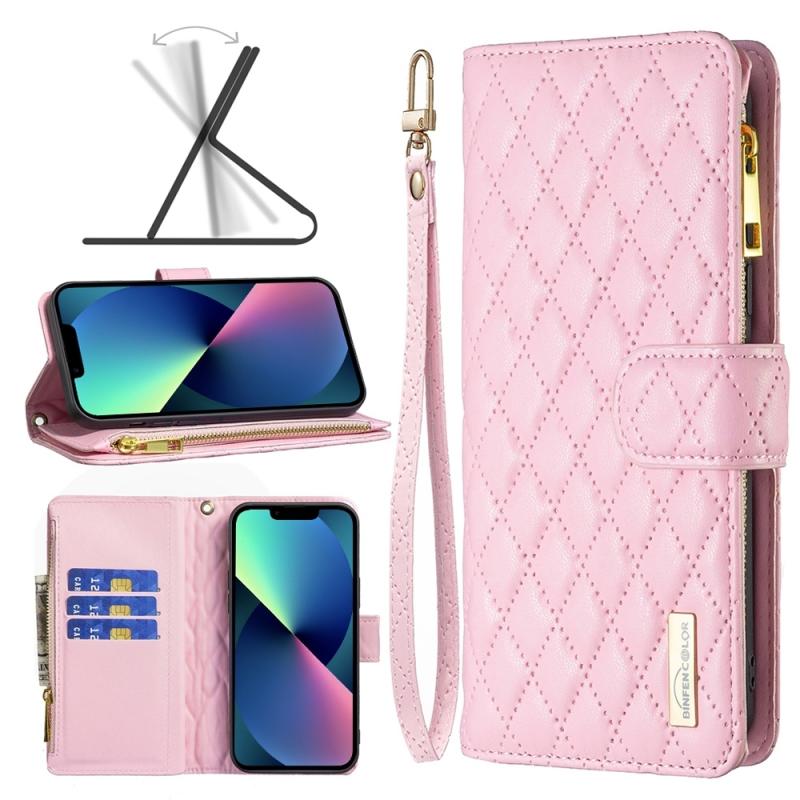 For iPhone 14 Diamond Lattice Zipper Wallet Leather Flip Phone Case (Pink)