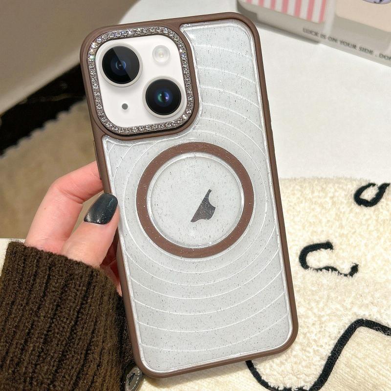 For iPhone 14 Diamond Lens Frame MagSafe Wave Texture Clear Phone Case(Brown)