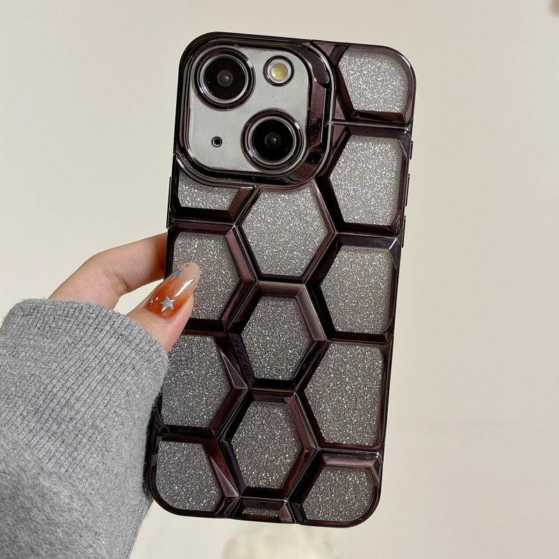 For iPhone 14 Electroplating Laser Engraving 3D Honeycomb Glitter TPU Phone Case(Black)