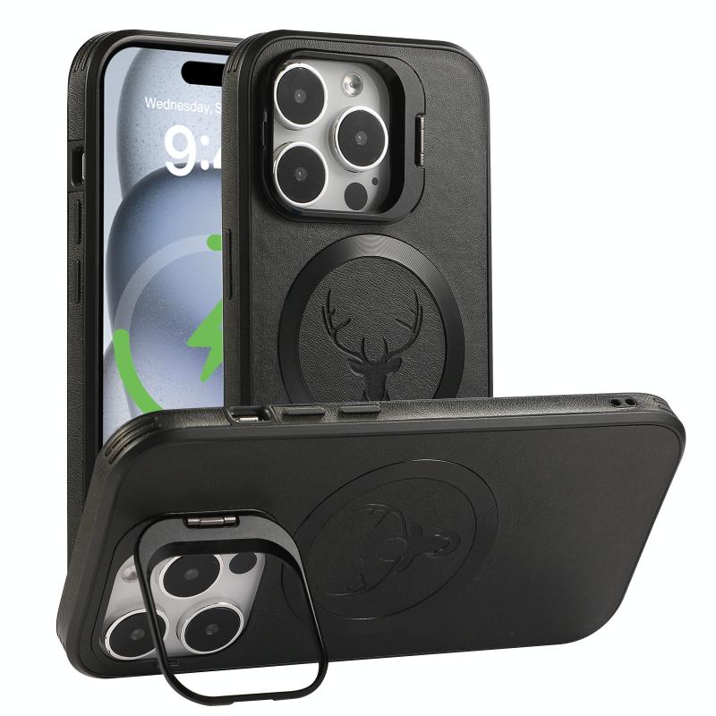 For iPhone 14 Elk Lens Holder Magsafe Shockproof Phone Case(Black)