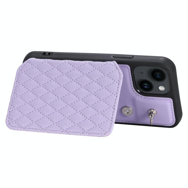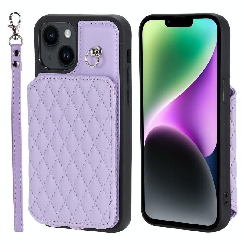 For iPhone 14 Grid Texture Card Bag Phone Case with Lanyard(Purple)