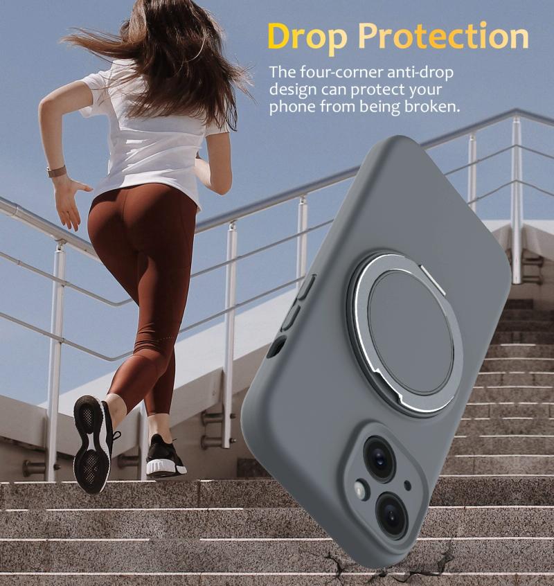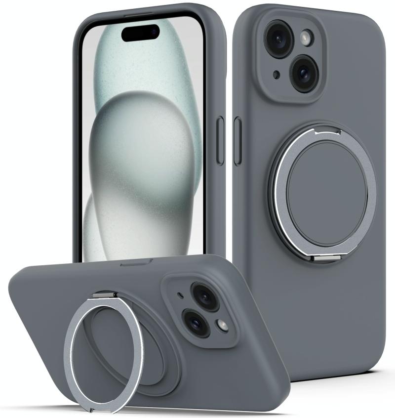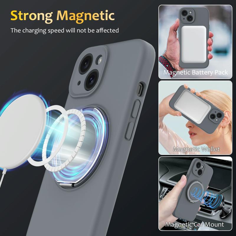 For iPhone 14 Liquid Silicone MagSafe Phone Case with Rotating Holder(Grey)