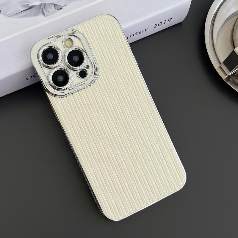 For iPhone 14 Plus Electroplated Silver Edge Grain Texture TPU Phone Case(Beige)