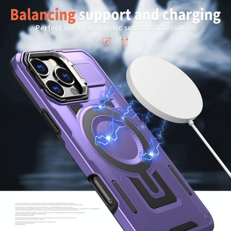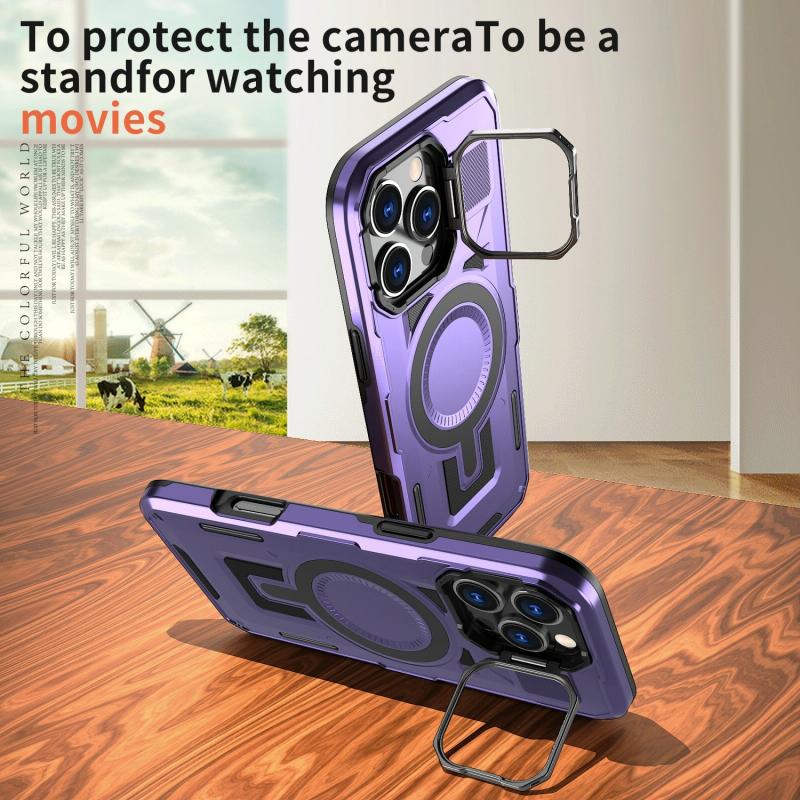 For iPhone 14 Shield Hollow Frame Holder MagSafe Phone Case(Purple)