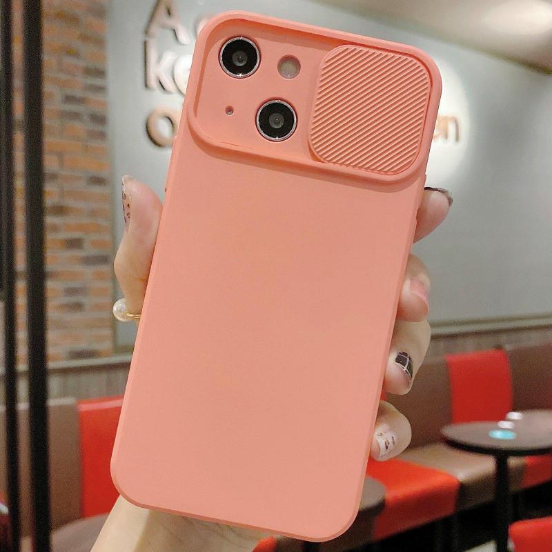 For iPhone 14 Slid Camera Shield Liquid Silicone TPU Phone Case(Pink Orange)