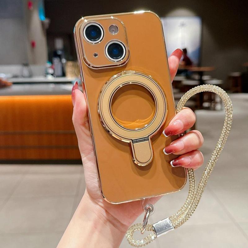 For iPhone 14 Solid Color Electroplated Metal Holder Phone Case with Lanyard(Brown)