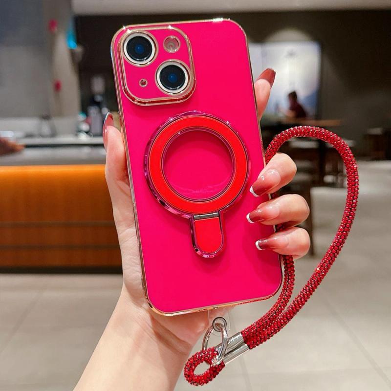 For iPhone 14 Solid Color Electroplated Metal Holder Phone Case with Lanyard(Rose Red)