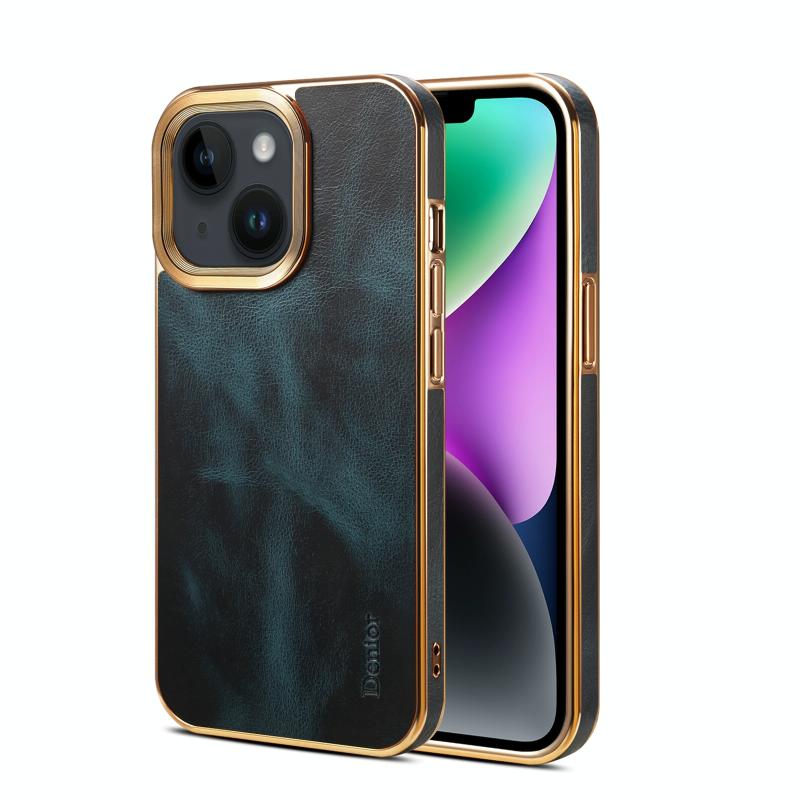 For iPhone 15 Plus Denior Oil Wax Cowhide Plating Phone Case(Blue) (Denior)
