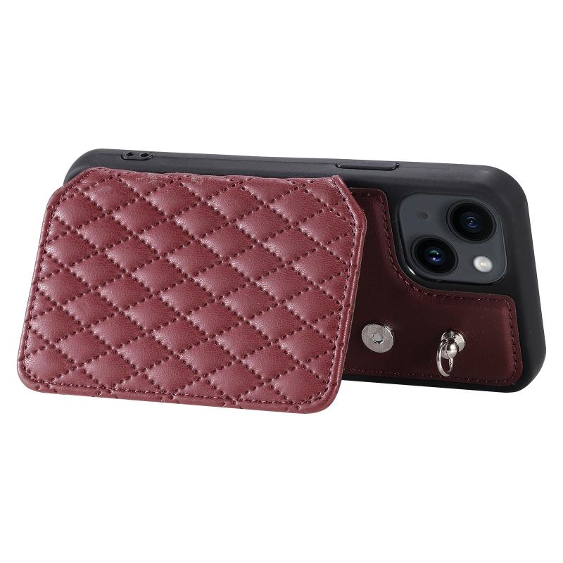 For iPhone 15 Plus Grid Texture Card Bag Phone Case with Lanyard(Red)