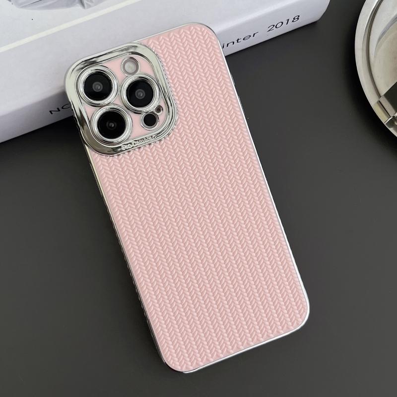 For iPhone 16 Pro Max Electroplated Silver Edge Grain Texture TPU Phone Case(Pink)