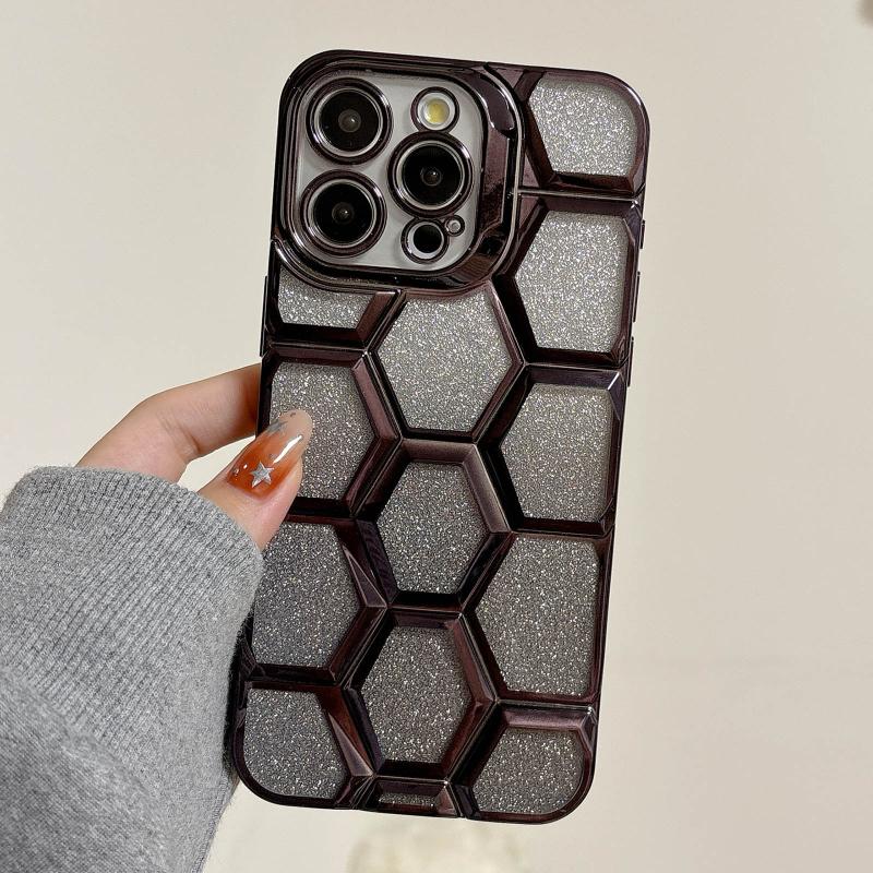 For iPhone 16 Pro Max Electroplating Laser Engraving 3D Honeycomb Glitter TPU Phone Case(Black)