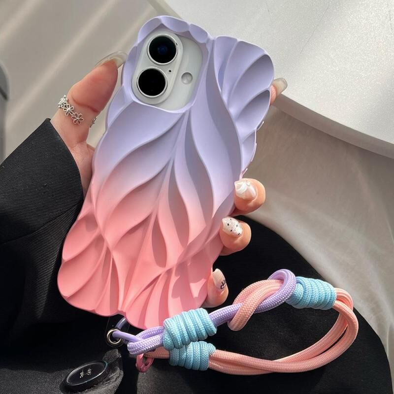 For iPhone 16 Thickened 3D Leaf Pattern Two-Color Oil-Sprayed TPU Phone Case with Strap(Purple Pink)