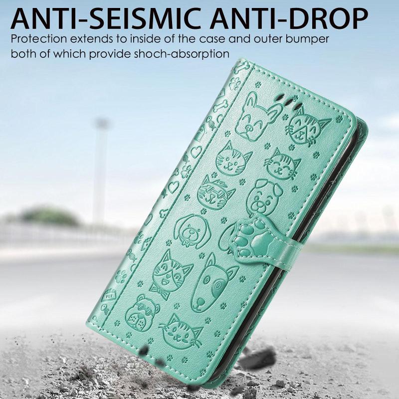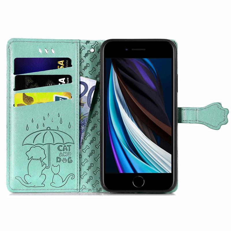 For iPhone 16e Cat and Dog Embossed Leather Phone Case(Green)