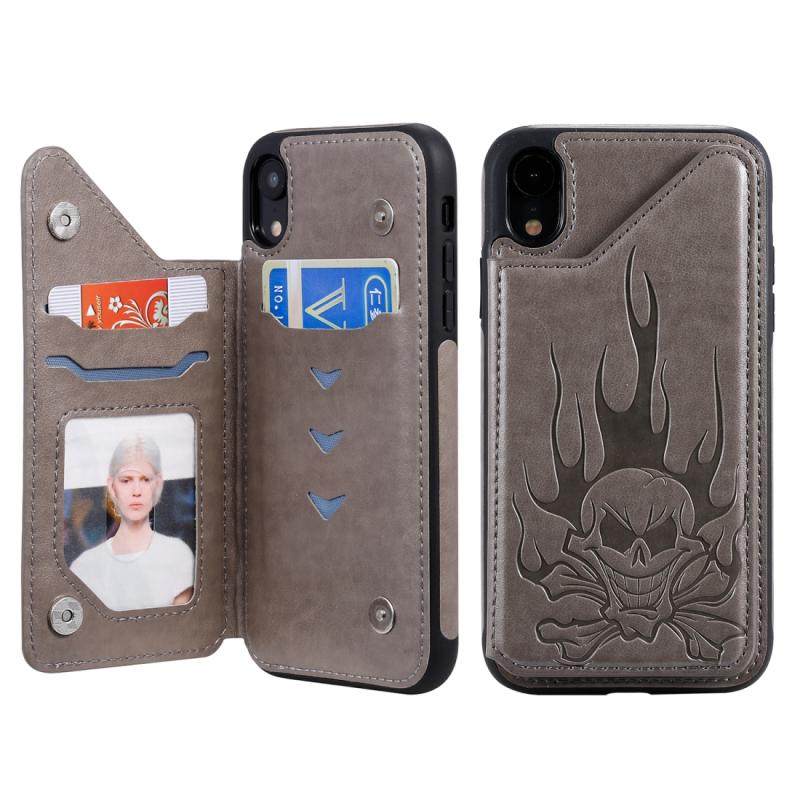 For iPhone XR Skull Head Embossing Pattern Shockproof Protective Case with Holder & Card Slots & Wallet(Grey)