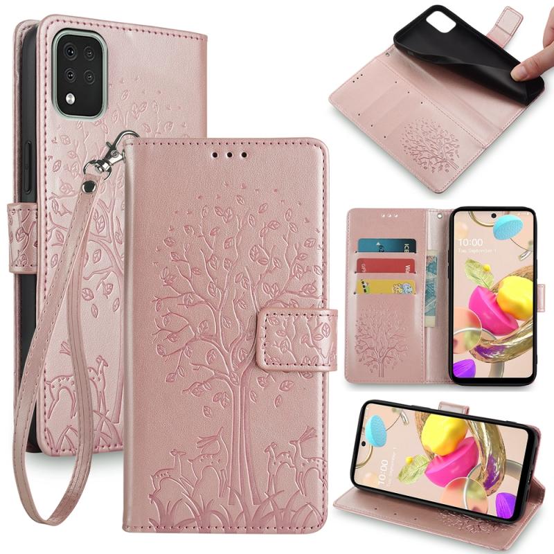 For LG K42 Tree & Deer Embossed Leather Phone Case(Rose Gold)