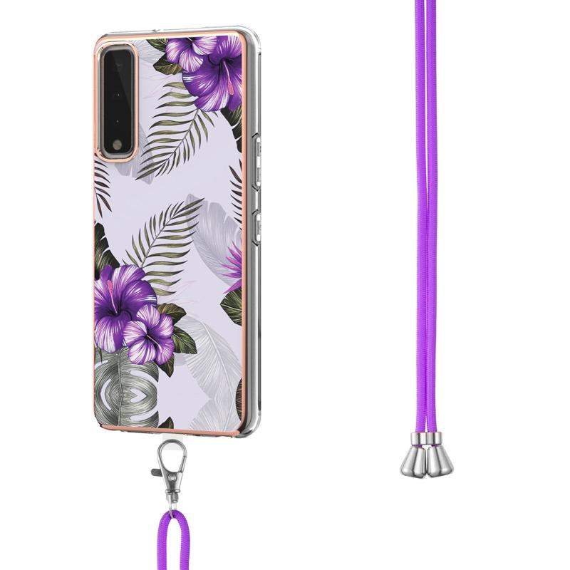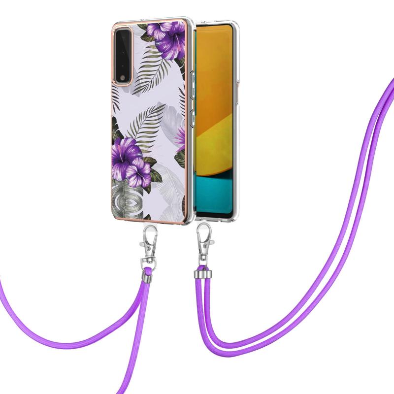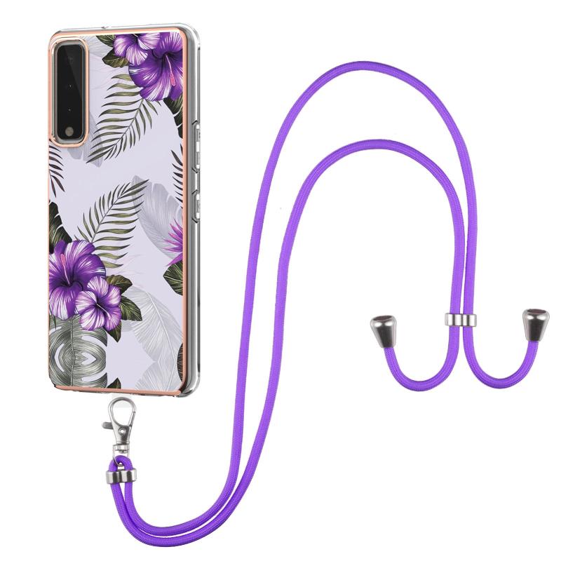 For LG Stylo 7 5G Electroplating Pattern IMD TPU Shockproof Case with Neck Lanyard(Purple Flower)
