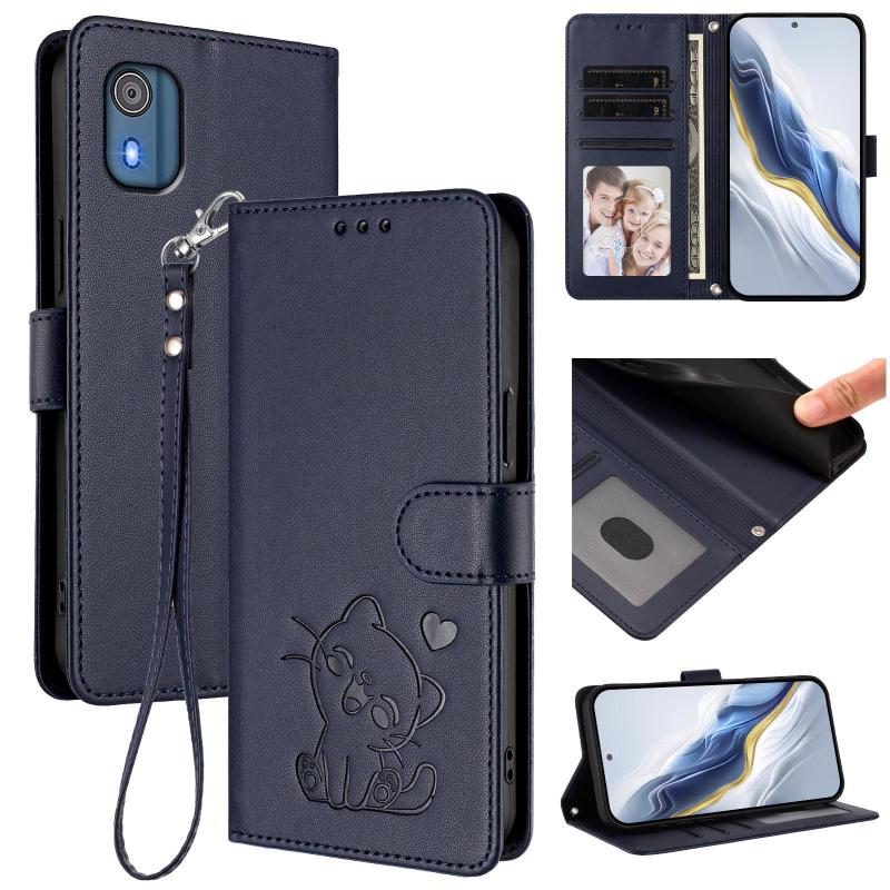 For Nokia C02 Embossed Heart Cat Leather Phone Case with Hand Strap(Blue)