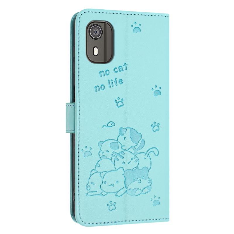 For Nokia C02 Embossed Kitten Phone Leather Case with Lanyard(Mint Green)