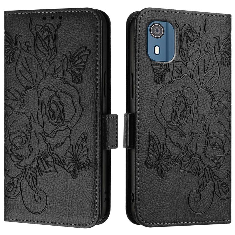 For Nokia C02 Embossed Rose RFID Anti-theft Leather Phone Case(Black)