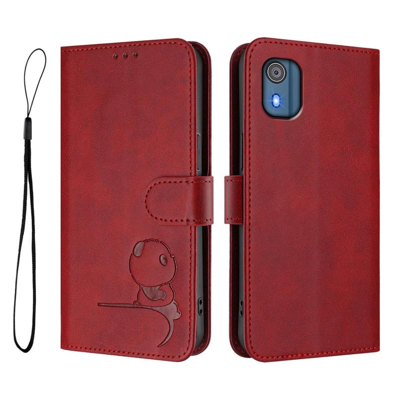 For Nokia C02 Litter Panda Embossing RFID Leather Phone Case with Lanyard(Wine Red)
