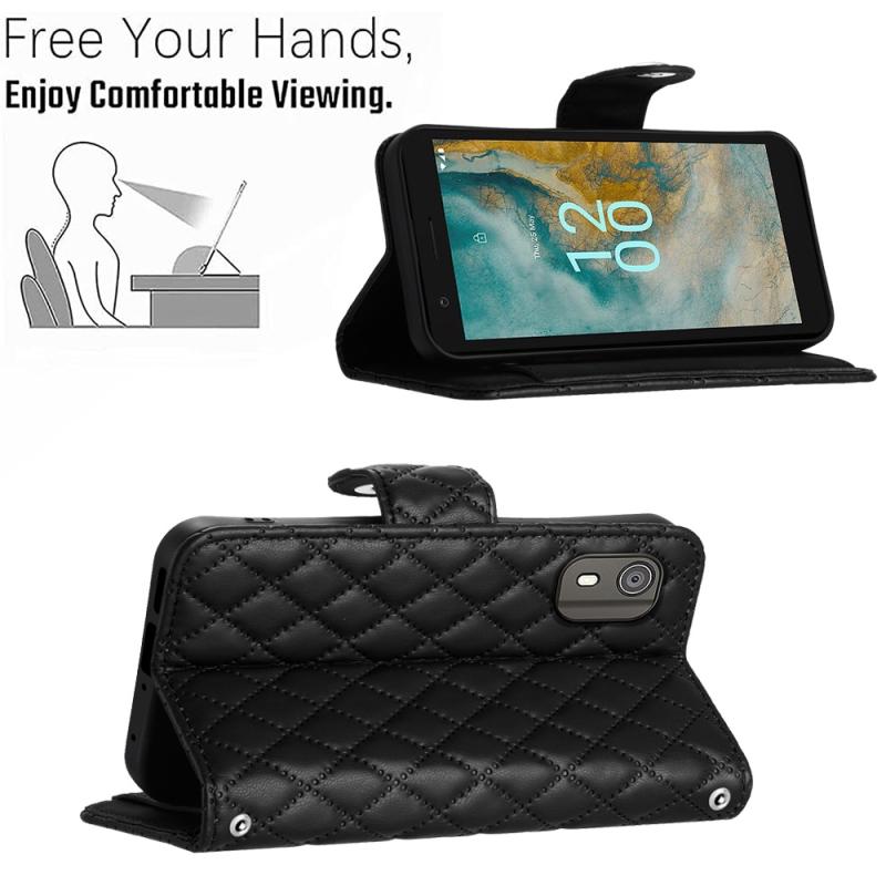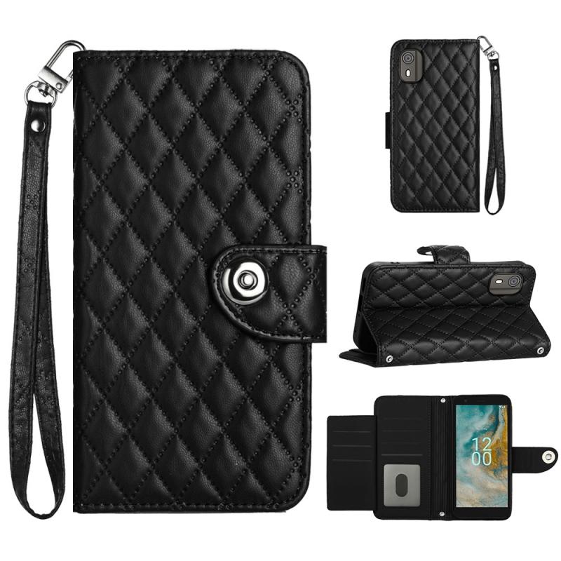 For Nokia C02 Rhombic Texture Flip Leather Phone Case with Lanyard(Black)