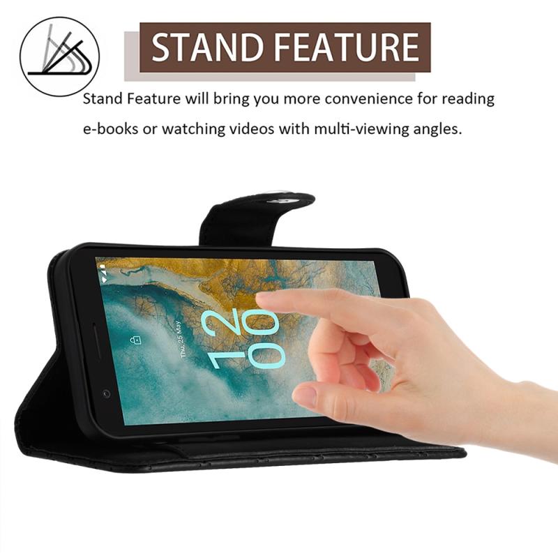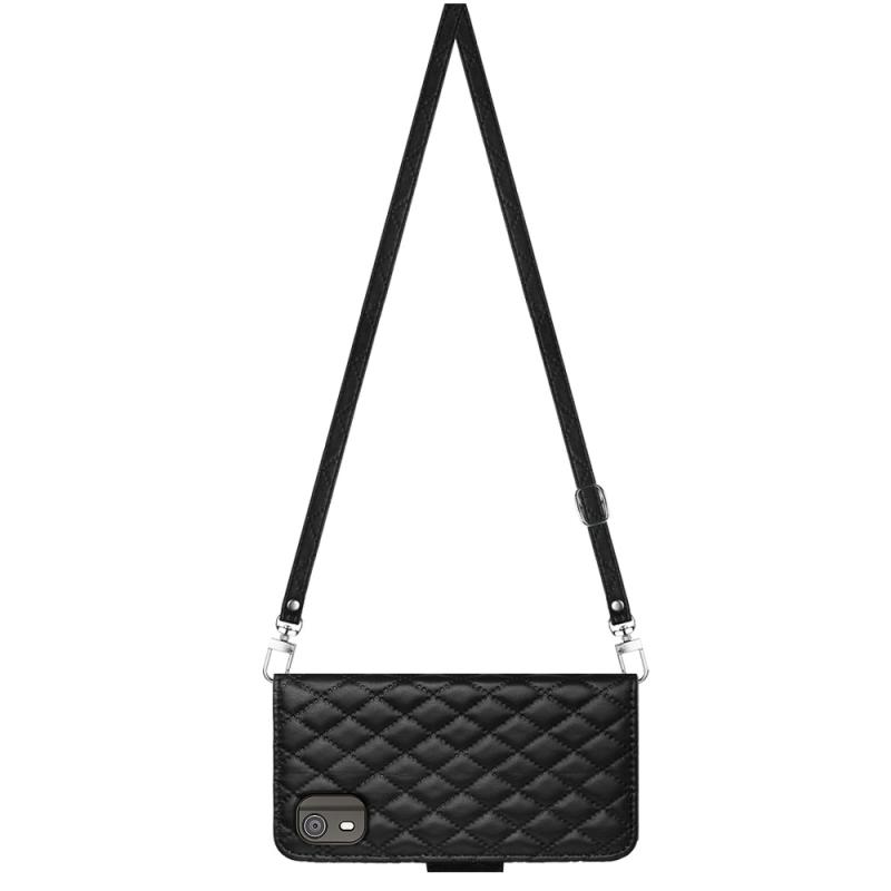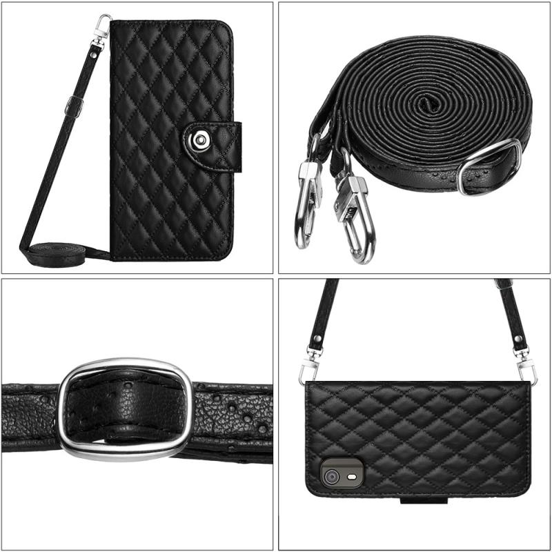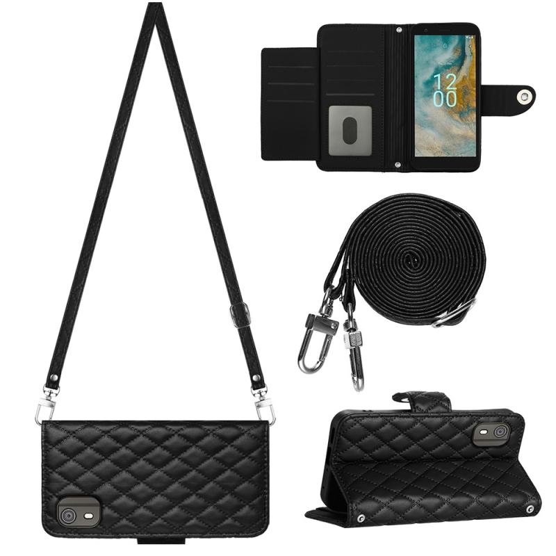 For Nokia C02 Rhombic Texture Flip Leather Phone Case with Long Lanyard(Black)