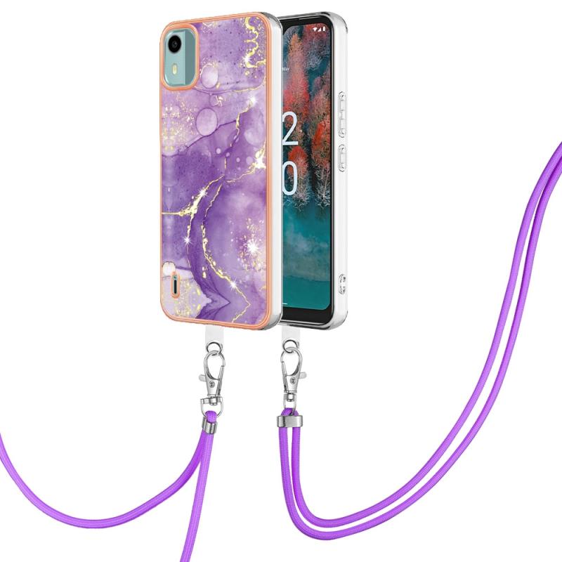 For Nokia C12 Electroplating Marble Dual-side IMD Phone Case with Lanyard(Purple 002)