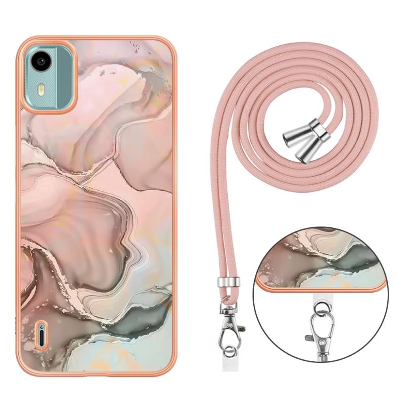 For Nokia C12 Electroplating Marble Dual-side IMD Phone Case with Lanyard(Rose Gold 015)