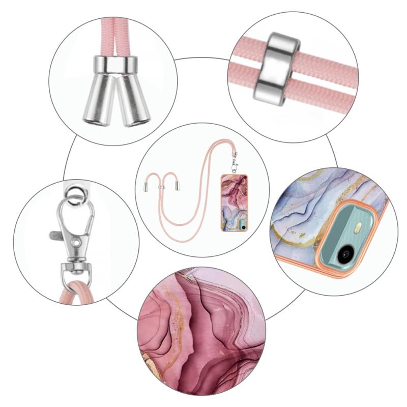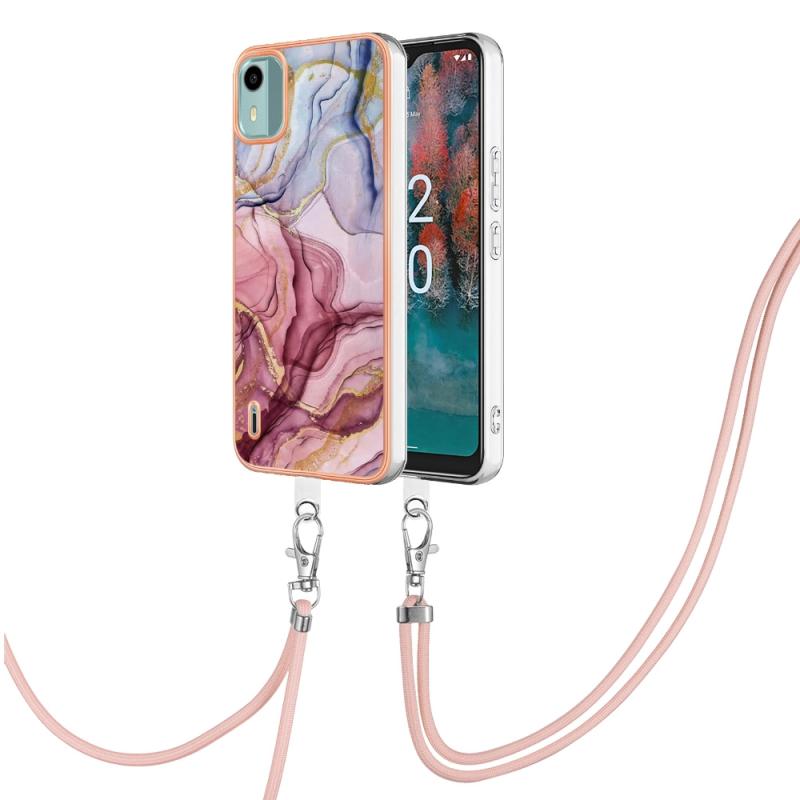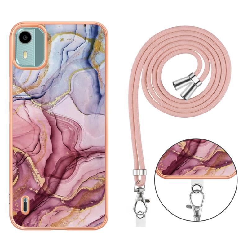 For Nokia C12 Electroplating Marble Dual-side IMD Phone Case with Lanyard(Rose Red 014)