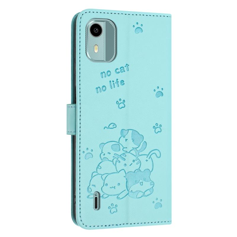 For Nokia C12 Embossed Kitten Phone Leather Case with Lanyard(Mint Green)