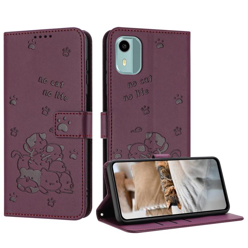 For Nokia C12 Embossed Kitten Phone Leather Case with Lanyard(Wine Red)