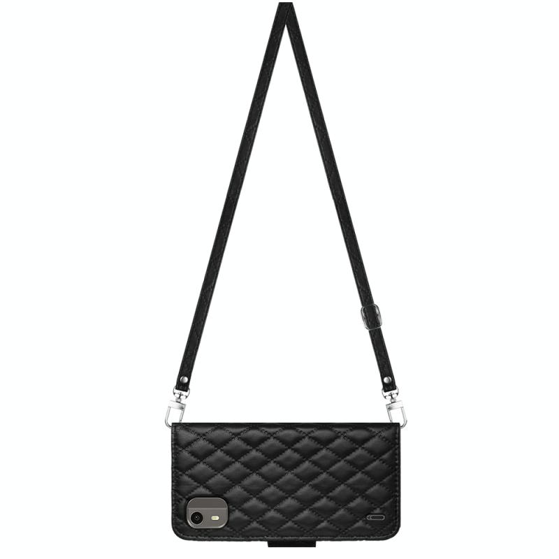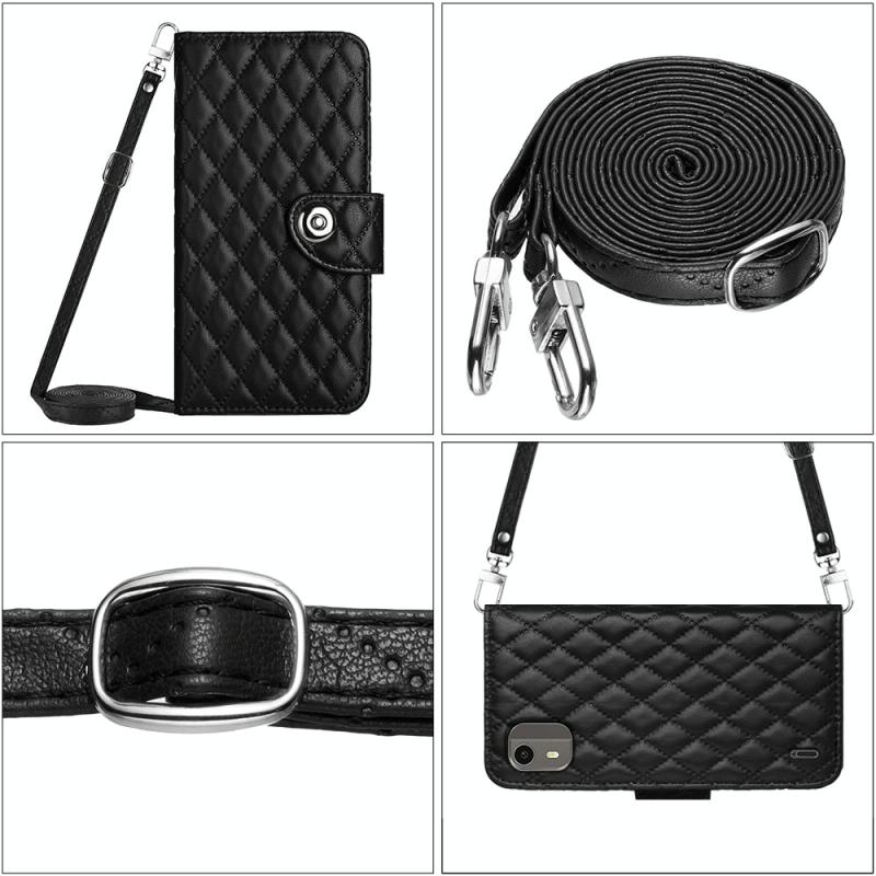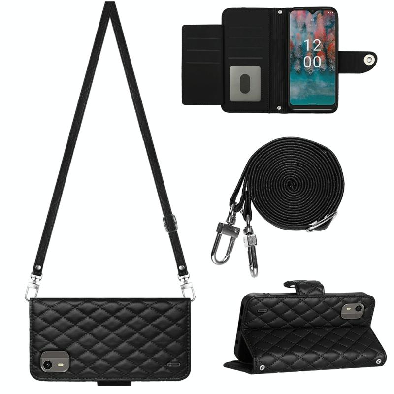 For Nokia C12 Rhombic Texture Flip Leather Phone Case with Long Lanyard(Black)