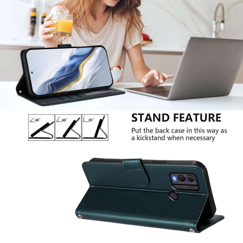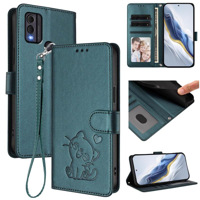 For Nokia C22 Embossed Heart Cat Leather Phone Case with Hand Strap(Dark Green)
