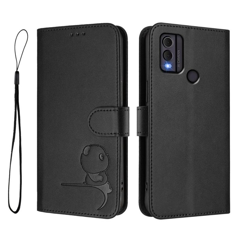 For Nokia C22 Litter Panda Embossing RFID Leather Phone Case with Lanyard(Black)