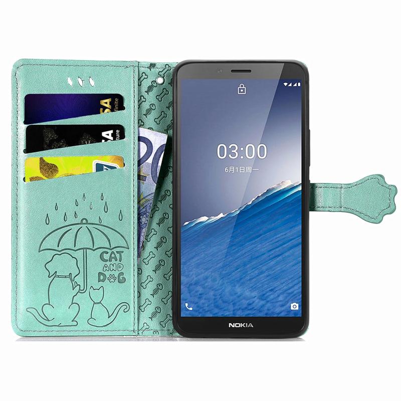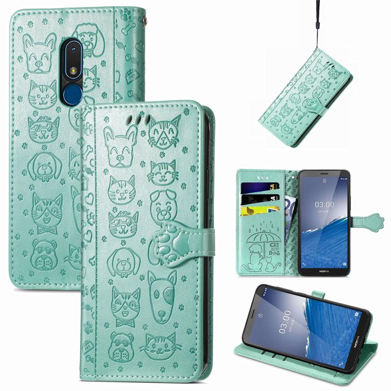 For Nokia C3 Cute Cat and Dog Embossed Flip Leather Phone Case(Green)