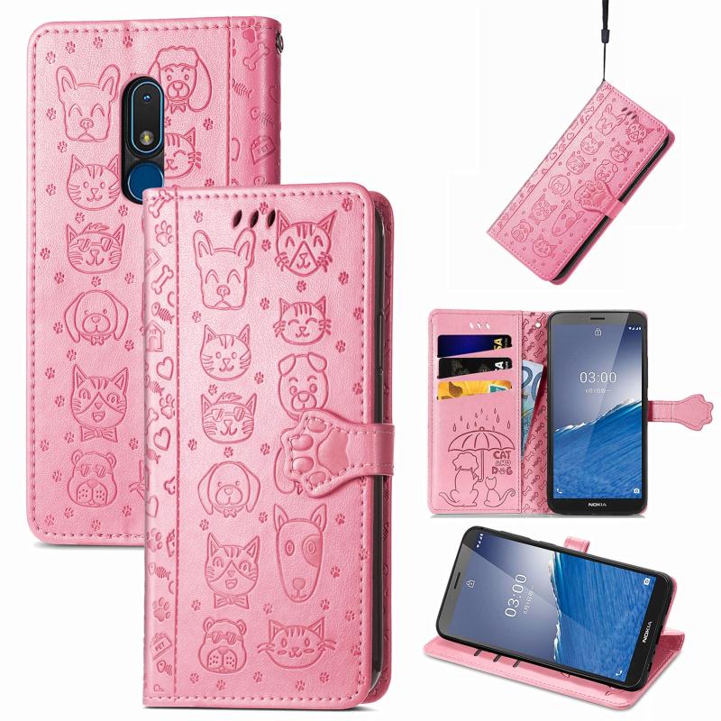 For Nokia C3 Cute Cat and Dog Embossed Flip Leather Phone Case(Pink)