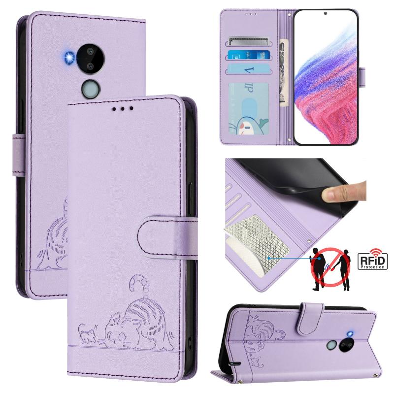 For Nokia C30 Cat Rat Embossed RFID Leather Phone Case with Lanyard(Purple)