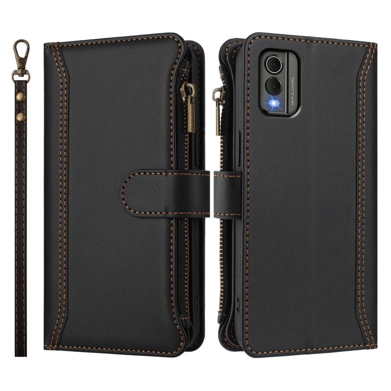 For Nokia C32 Magnetic Closure 9 Card Slots Zipper Leather Case with Hand Strap(Black)