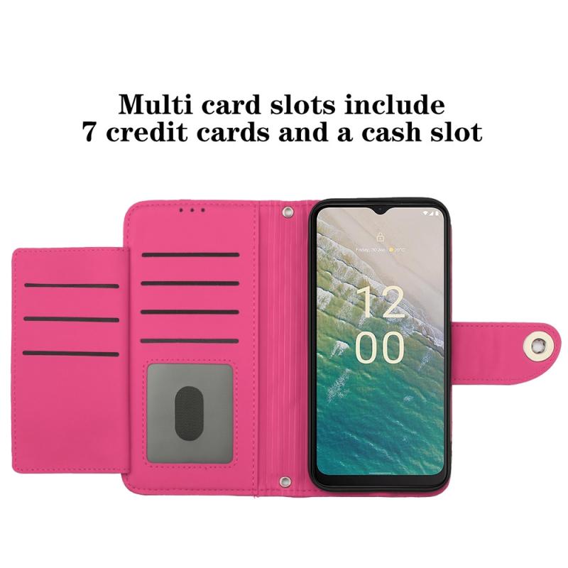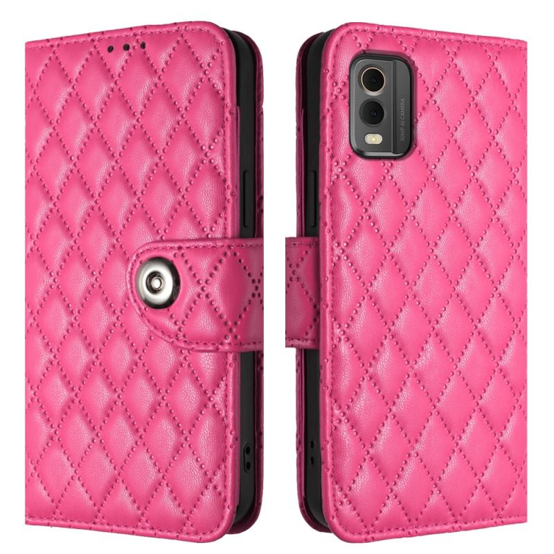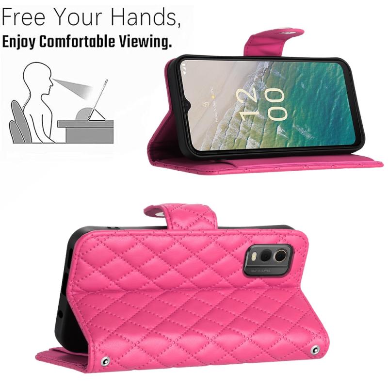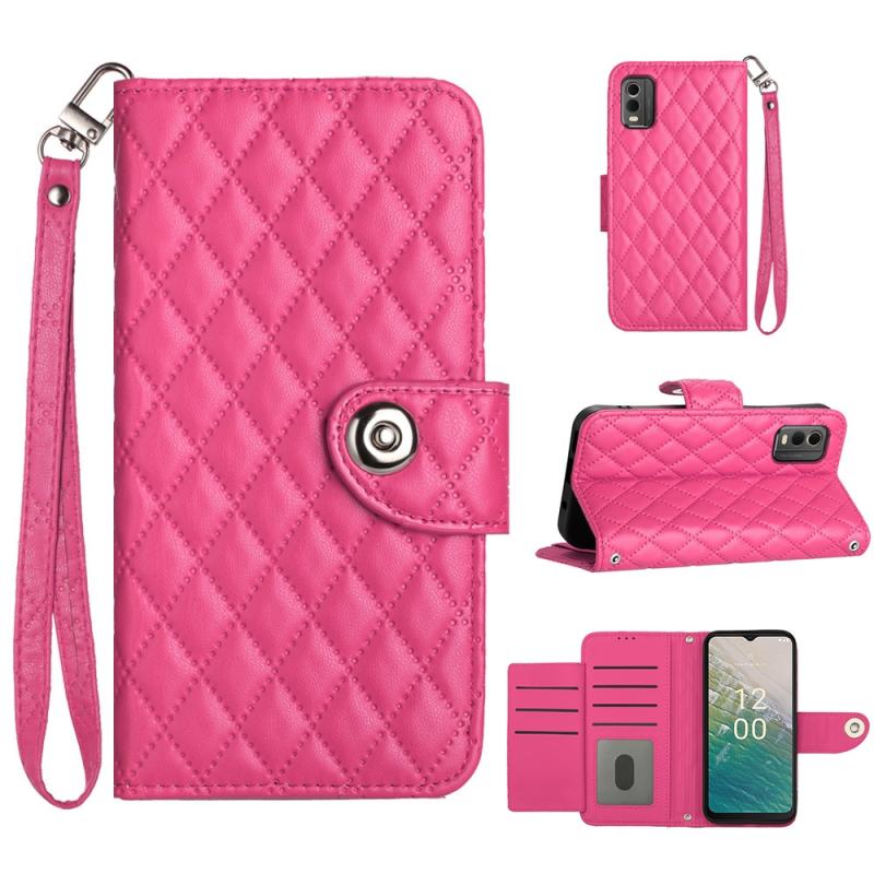 For Nokia C32 Rhombic Texture Flip Leather Phone Case with Lanyard(Rose Red)