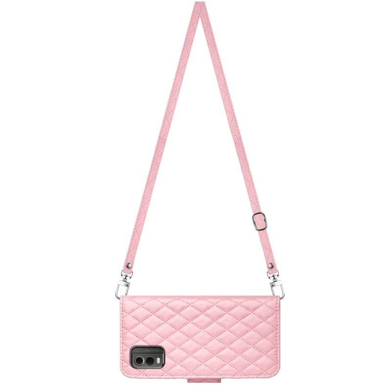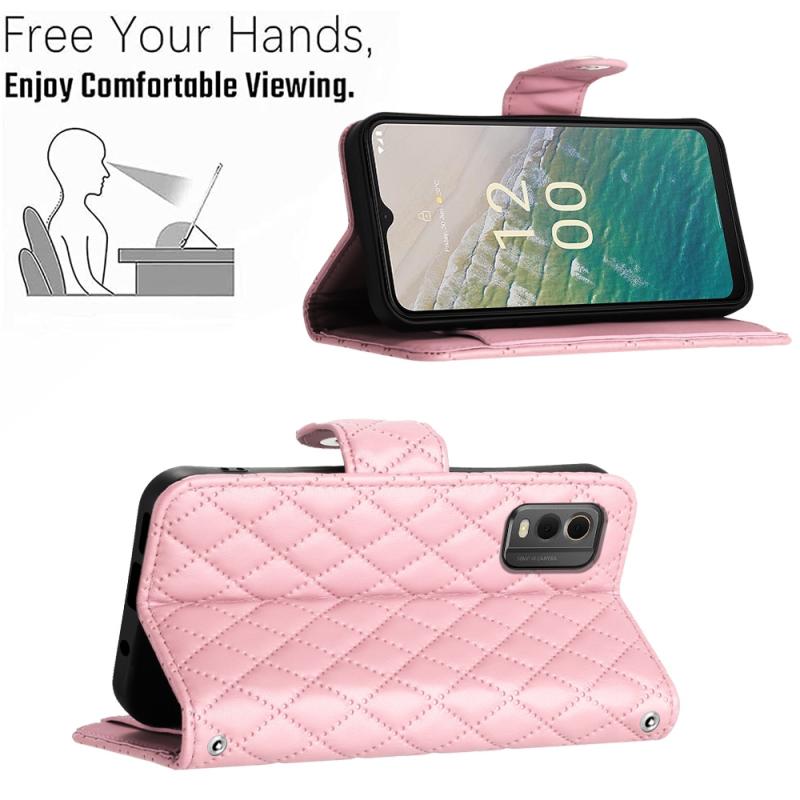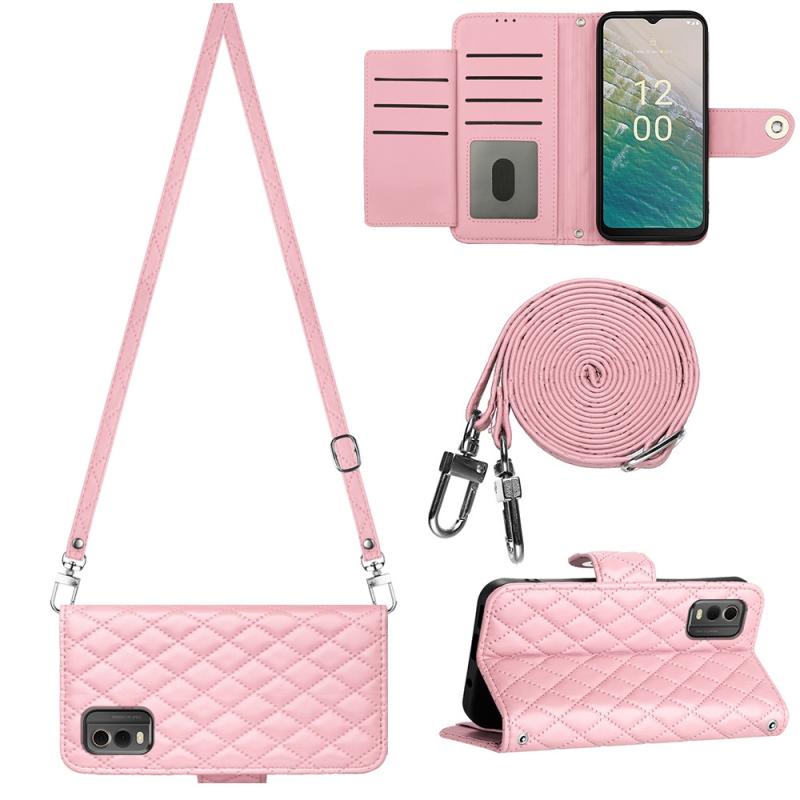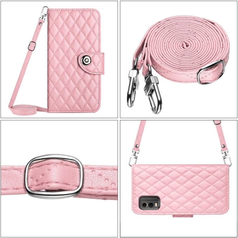 For Nokia C32 Rhombic Texture Flip Leather Phone Case with Long Lanyard(Pink)