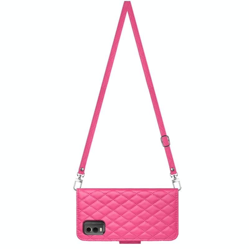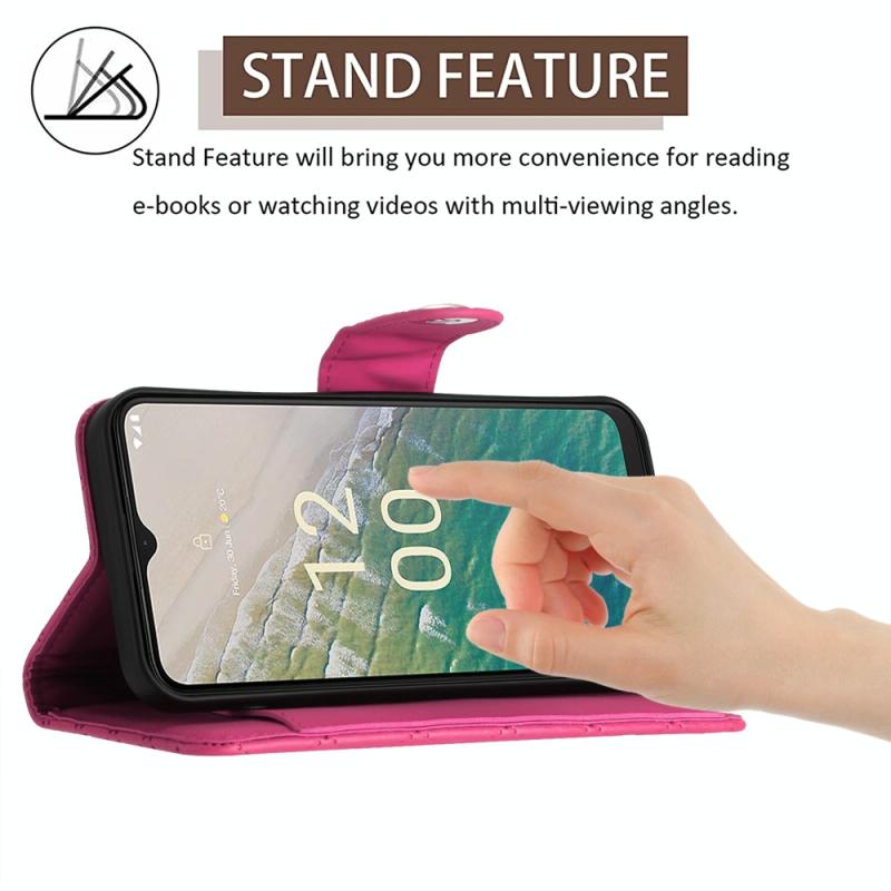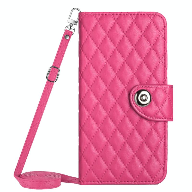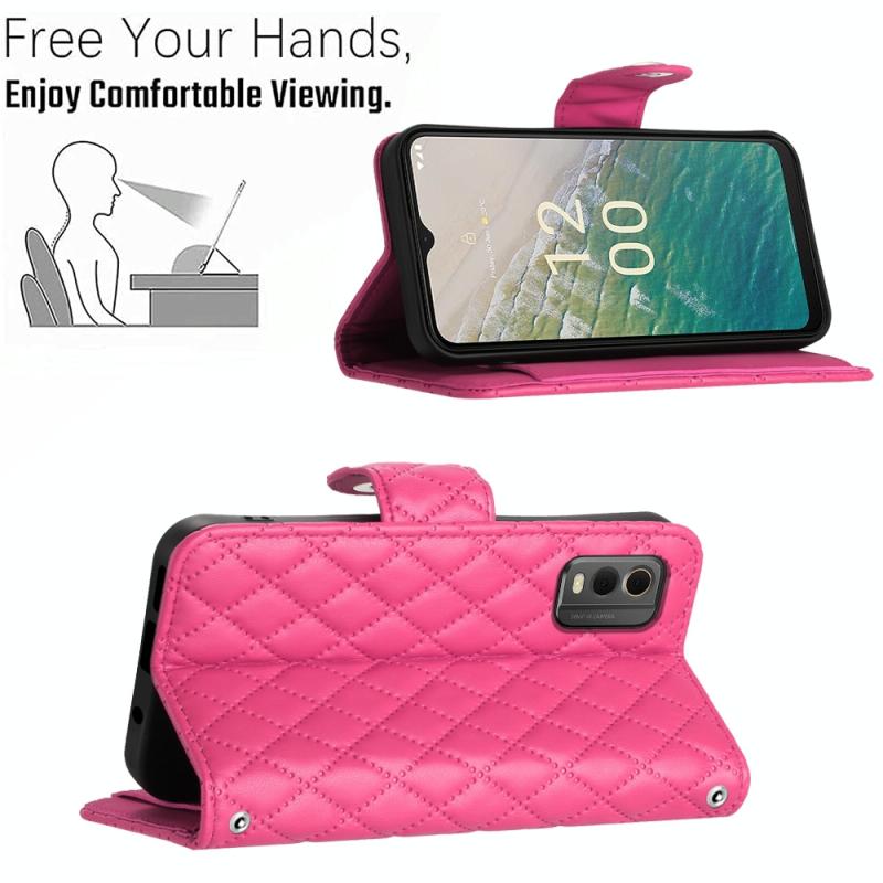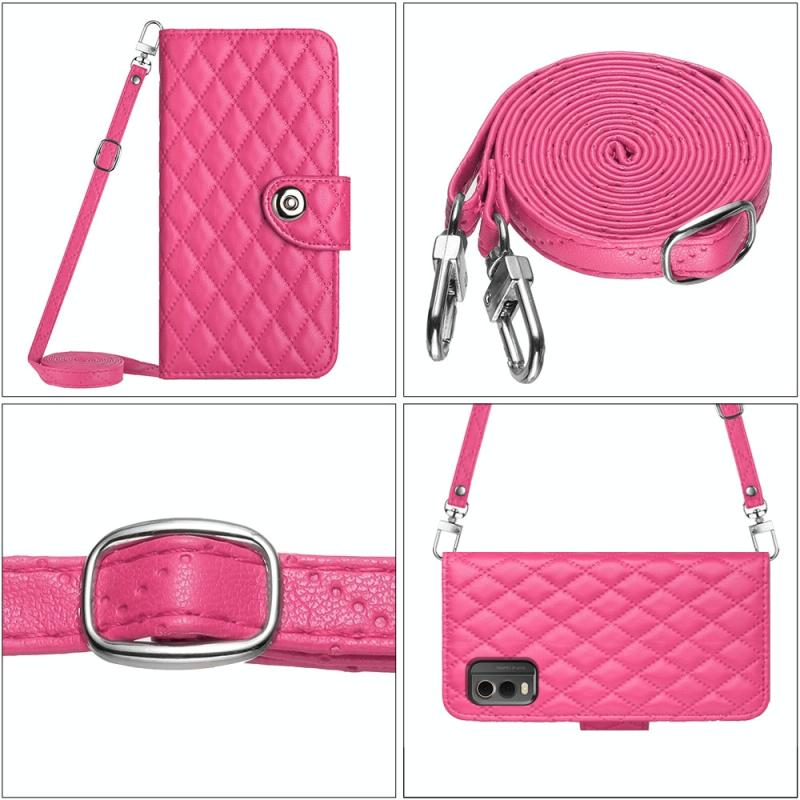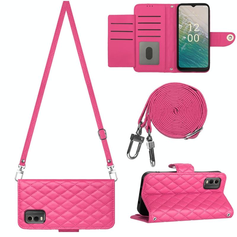 For Nokia C32 Rhombic Texture Flip Leather Phone Case with Long Lanyard(Rose Red)