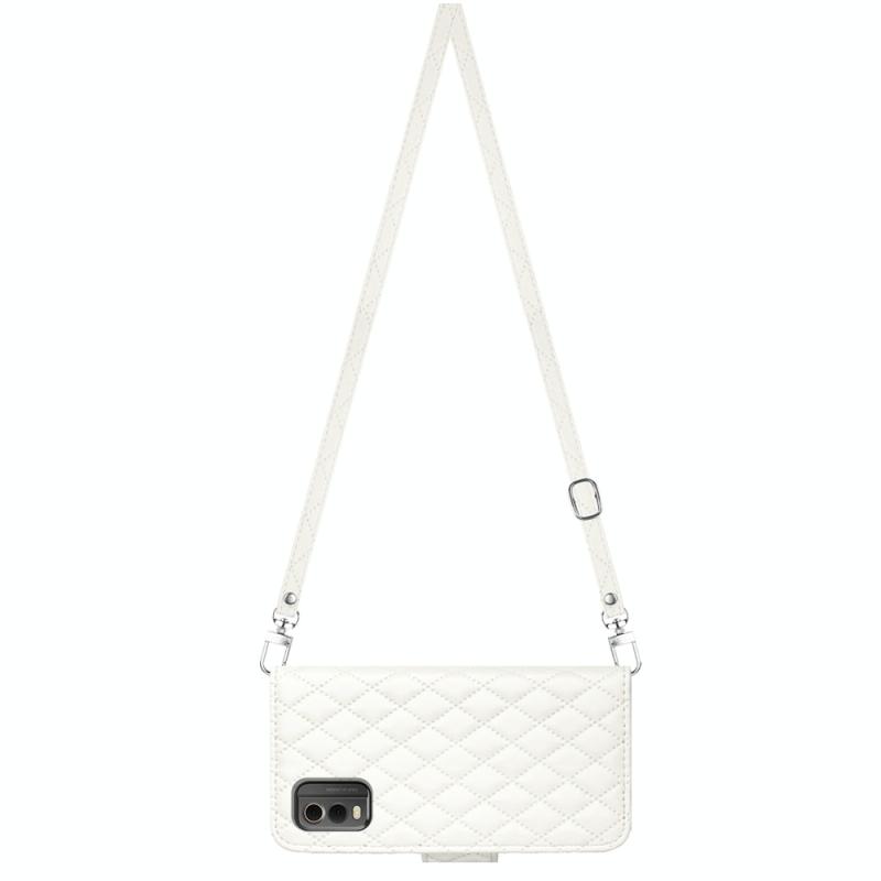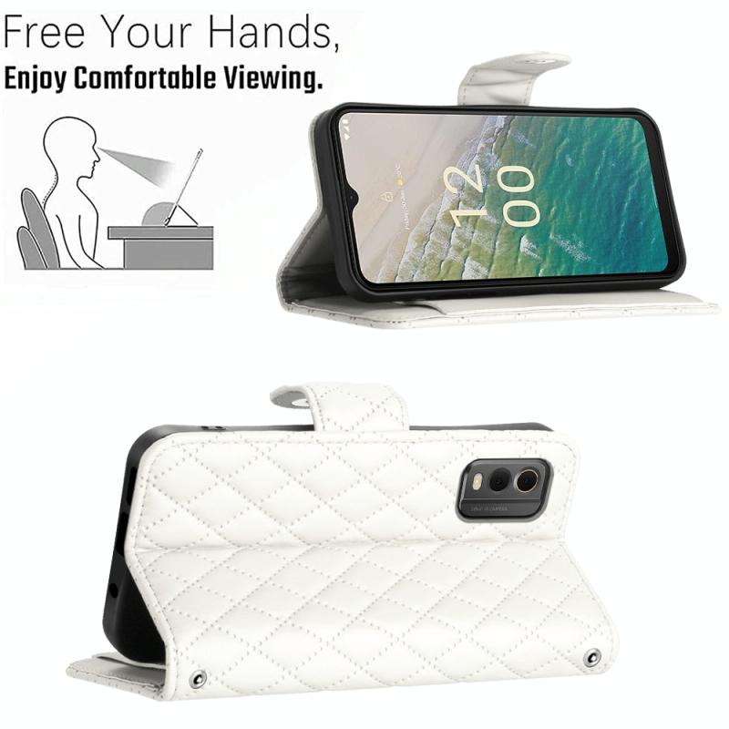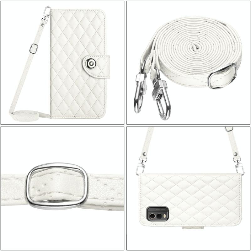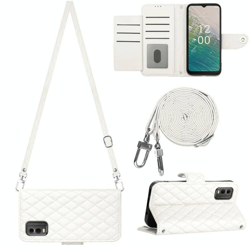 For Nokia C32 Rhombic Texture Flip Leather Phone Case with Long Lanyard(White)