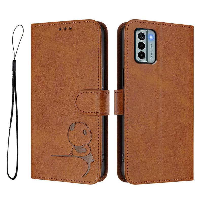 For Nokia G22 Litter Panda Embossing RFID Leather Phone Case with Lanyard(Brown)