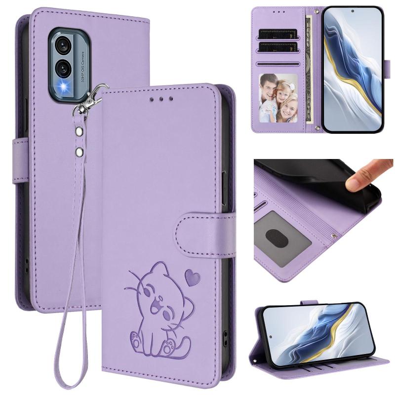 For Nokia X30 Embossed Heart Cat Leather Phone Case with Hand Strap(Light Purple)