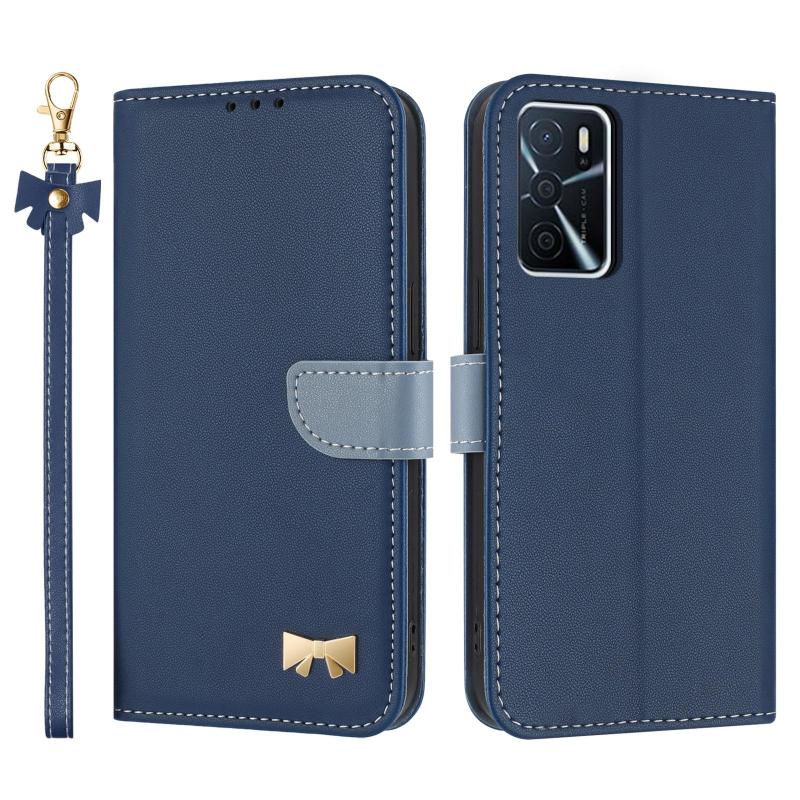 For OPPO A16 Metal Bow Leather Phone Case with Hand Strap(Dark Blue)